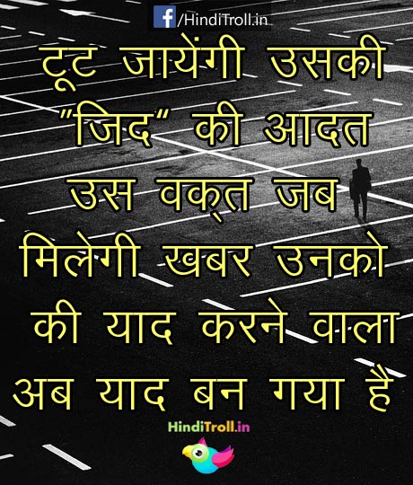Hindi Zid Love Shayari Whatsapp Status Images Pics Dard Image Free Dowwnload दोस्तों इस पेज पर हम आपके लिए पेश कर रहे हैं कुछ बेस्ट zid motivational quotes in hindi ये motivational thoughts टेक्स्ट और बेहतरीन फोटोज और images के रूप में भी दिए जा रहे हैं जिससे दोस्तों हर रोज़ कम से कम एक zid motivational quotes in hindi पढने और शेयर करने की आदत बना लीजिये, अगर आप सुबह सुबह सबसे पहले ये काम.
